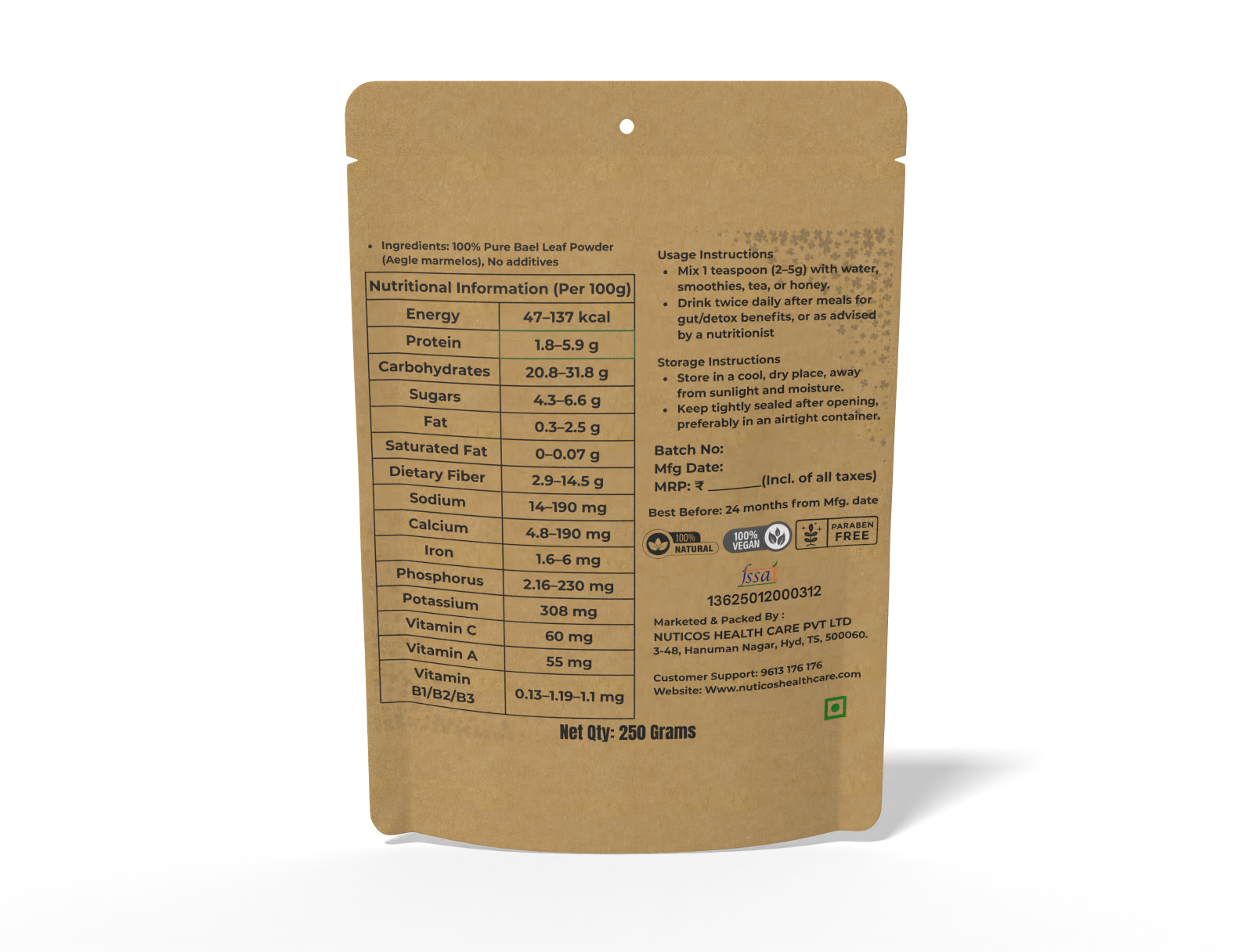 Nuticos Bael Leaf Powder is a natural supplement and herbal remedy known for supporting digestive health, immunity, and overall wellness. It helps maintain daily vitality, supports liver function, and promotes a balanced digestive system naturally, making it ideal for preventive wellness.
