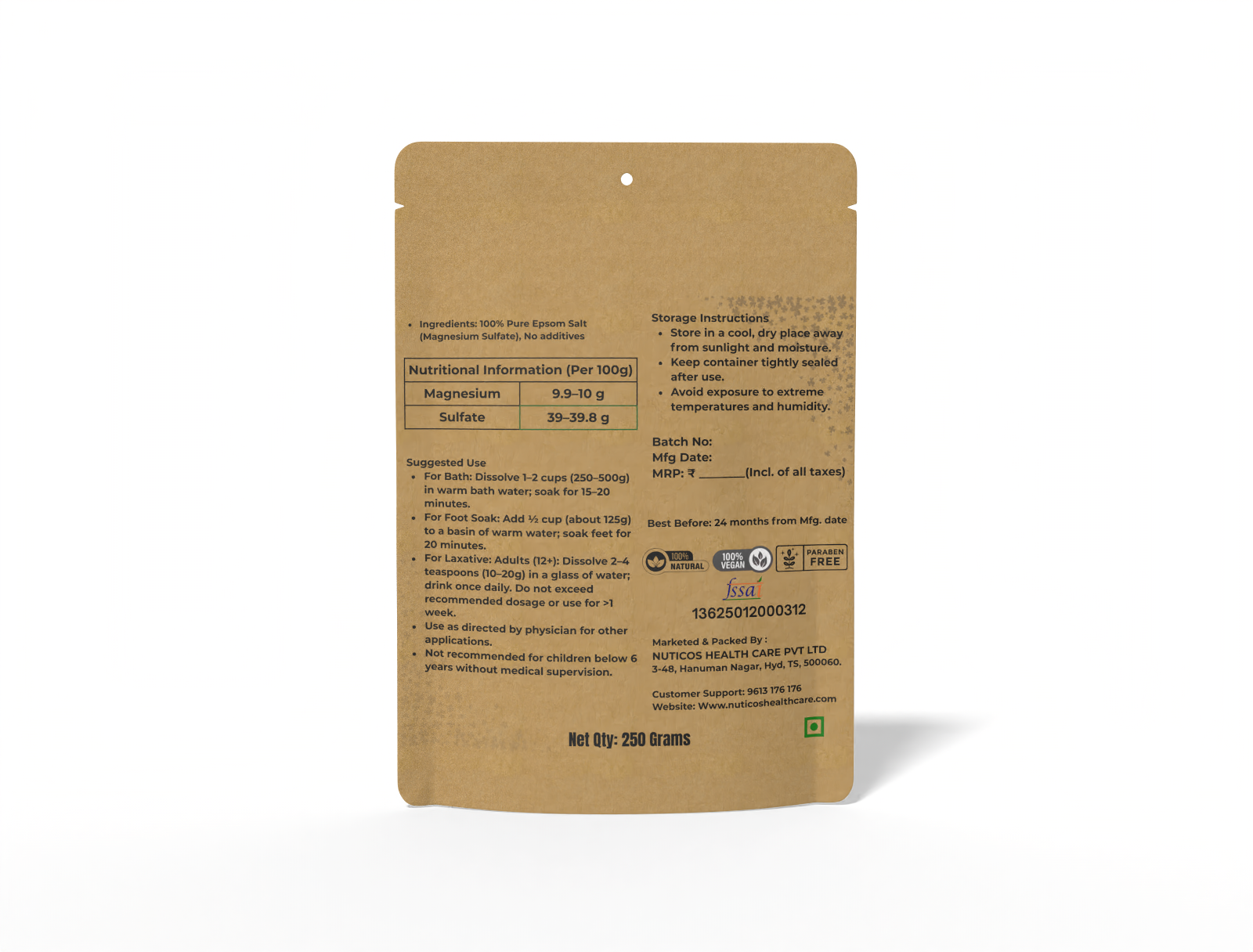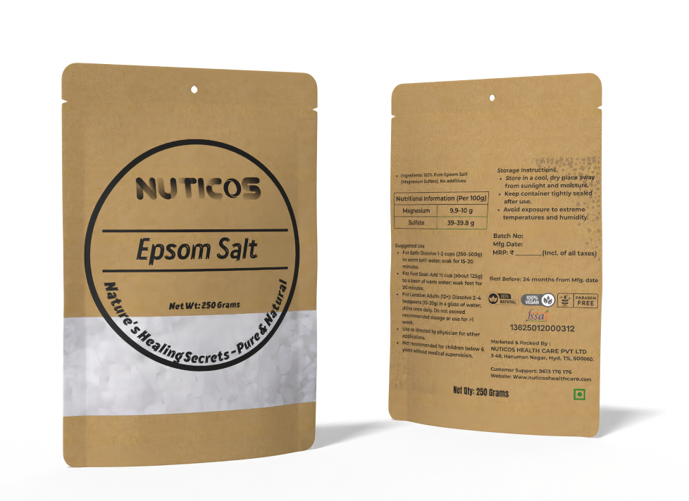 Nuticos Epsom Salt is a natural supplement and herbal remedy designed to support relaxation, muscle recovery, and overall wellness. Rich in magnesium and sulfate, it promotes stress relief, soothes tired muscles, and enhances daily vitality, making it ideal for holistic preventive self-care.