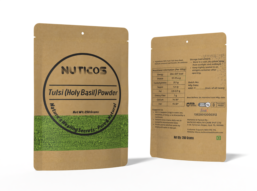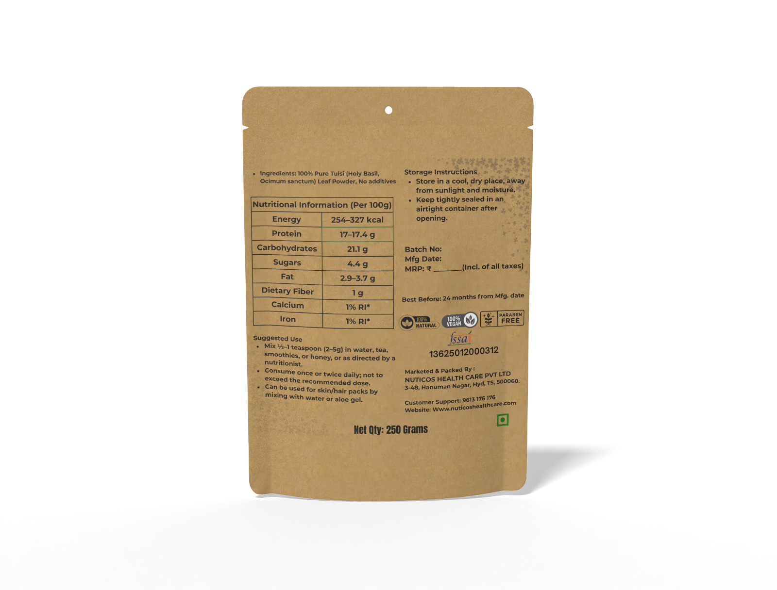 • Ingredients:Tulsi (Holy Basil) Leaf Powder – naturally dried and finely milled.