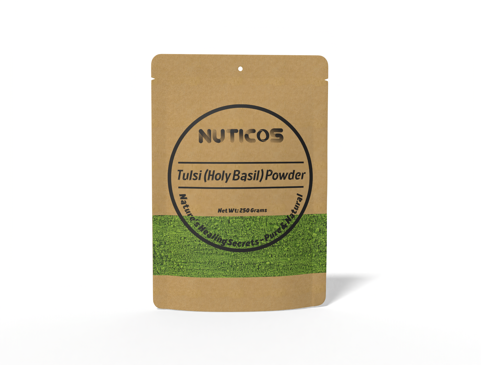 Nuticos Tulsi Powder is a pure Ayurvedic natural supplement crafted from the sacred Ocimum sanctum (Holy Basil). Known as the “Queen of Herbs,” Tulsi supports immunity, respiratory wellness, stress relief, and overall vitality. This herbal remedy helps balance mind and body, promoting holistic wellness for daily living.